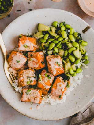 This protein-packed Bang Bang Salmon Bowl is a flavor-packed meal featuring air-fried salmon, a creamy sweet-spicy sauce, and a crunchy cucumber edamame salad served over rice. If you love bold flavors and easy-to-make meals, this …