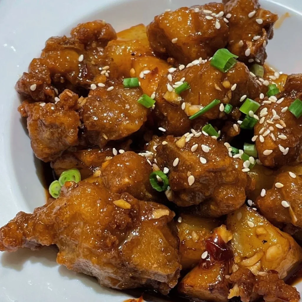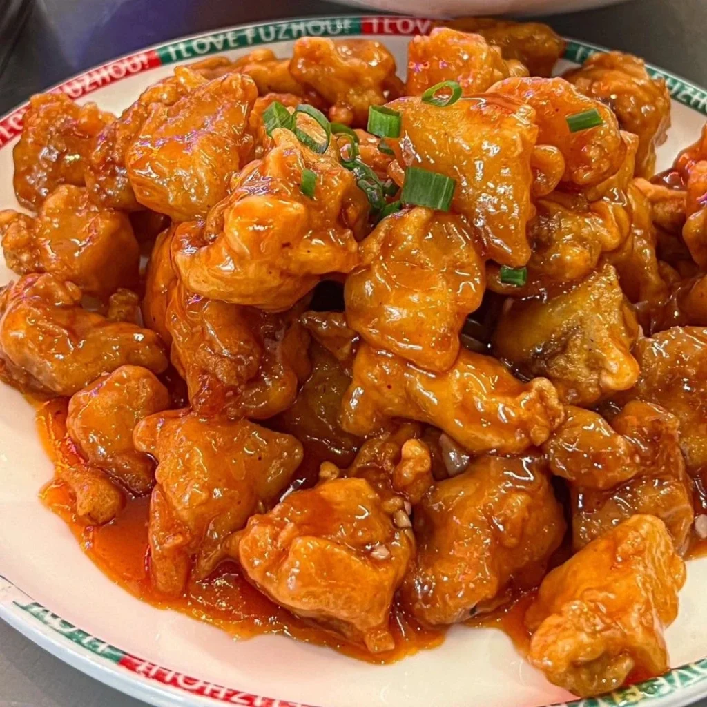Deep-fried pork in a sweet and sour sauce, with a distinctive lychee-like appearance.