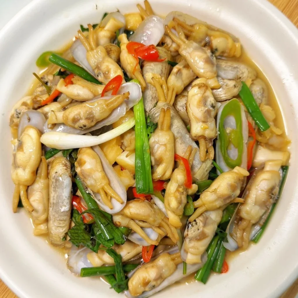 Razor clams stir-fried with vegetables, offering a delicious blend of freshness and umami flavors.